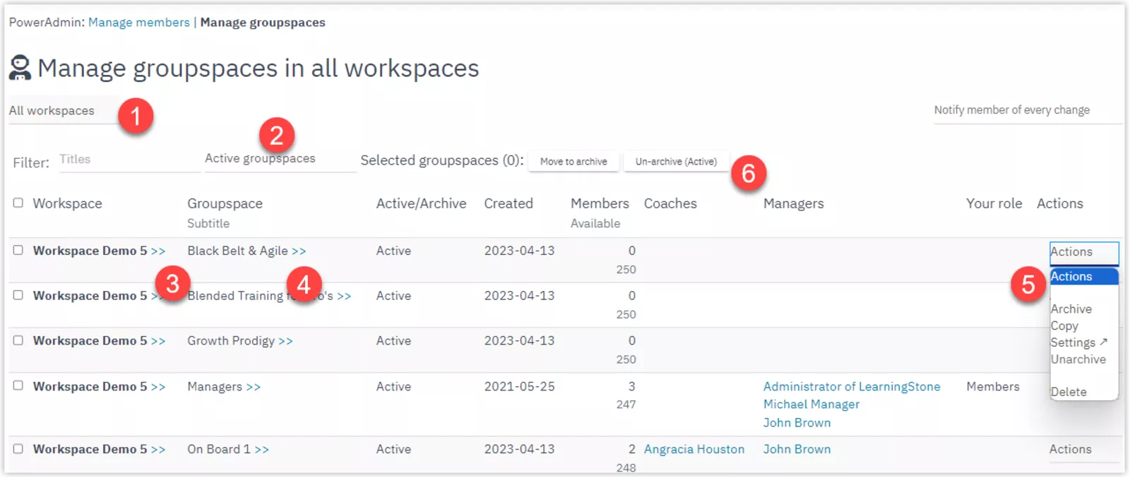 - Choose actions for selected groupspaces (select with checkboxes on the left).